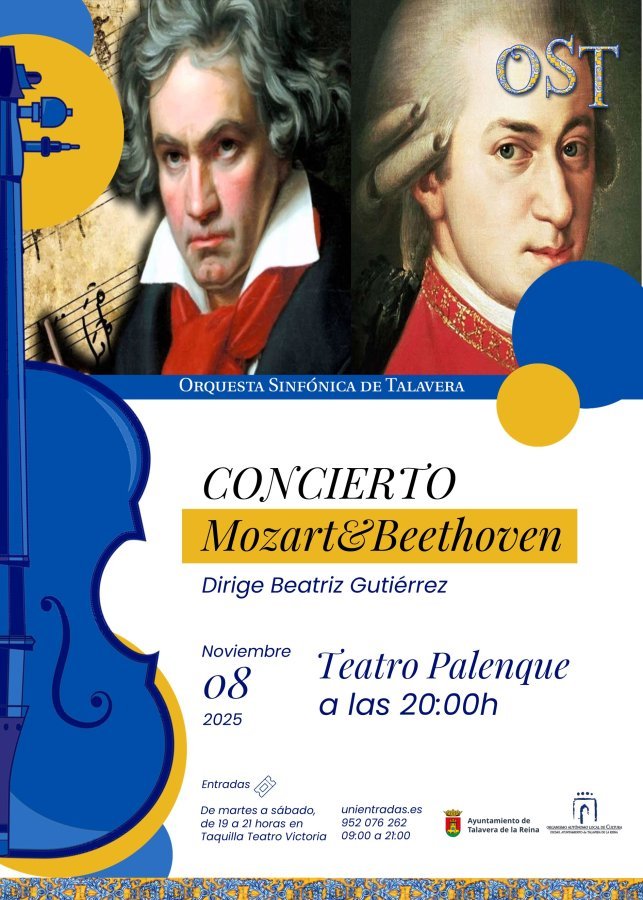 La Orqueta Sinfónica de Talavera interpretará obras de dos de los más grandes compositores de la música clásica de todos los tiempos, W. Amedeus Mozart y Ludwig van Beethoven. En la primera parte del concierto podremos disfrutar de la Obertura “Cosi fan tutte" y el Concierto en La M para clarinete de Mozart, y en la segunda parte de la Sinfonía nº7 de Beethoven.