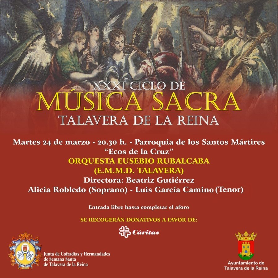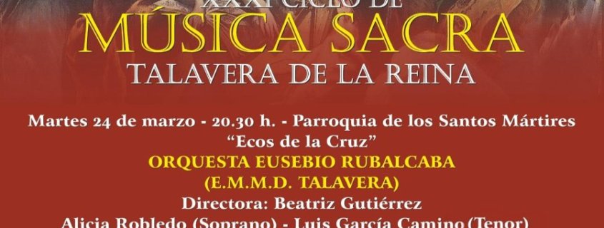 La Orquesta Eusebio Rubalcaba de la Escuela Municipal de Música y Danza de Talavera de la Reina dentro del XXXI Ciclo de Música Sacra junto con la soprano Alicia Robledo y el tenor Luis García, ofrecerán un Concierto orgnizado por la Junta de Cofradías y Hermandades de Semana Santa de Talavera de la Reina con un repertorio del que todos los asistentes seguro disfrutarán.